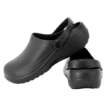 Available in five dual sizes, Non-slip outer sole to grip floors, Comfortable moulded inner sole, Adjustable hinged heel strap, Lightweight and waterproof, Anti-static, Shock absorbent