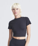 Cropped length. Fitted silhouette. Four-way stretch fabric. Wicking, quick-dry fabric. Twin-needle stitching details. Made with recycled polyester. Tear-away label.